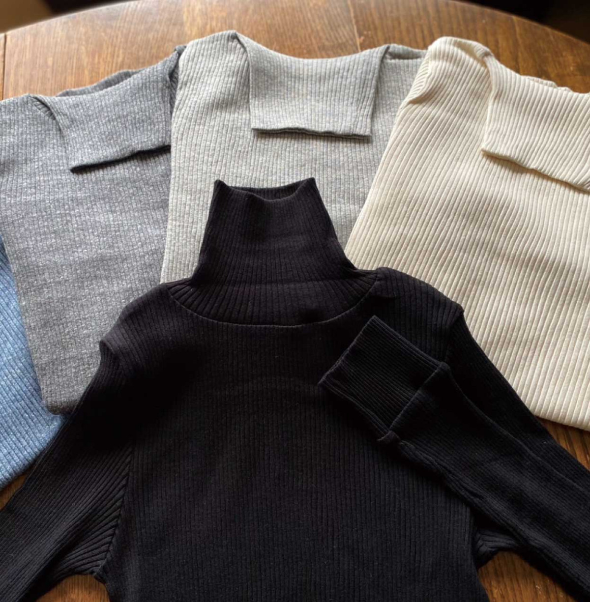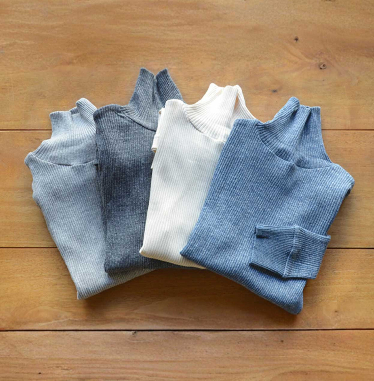 やわらかなオーガニックコットンをリブ編みに仕立てたタートルネックは、