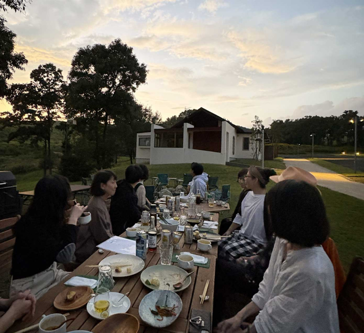 広々とした大自然の中、朝は会長主催の瞑想からスタート。