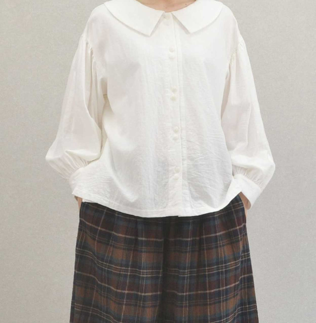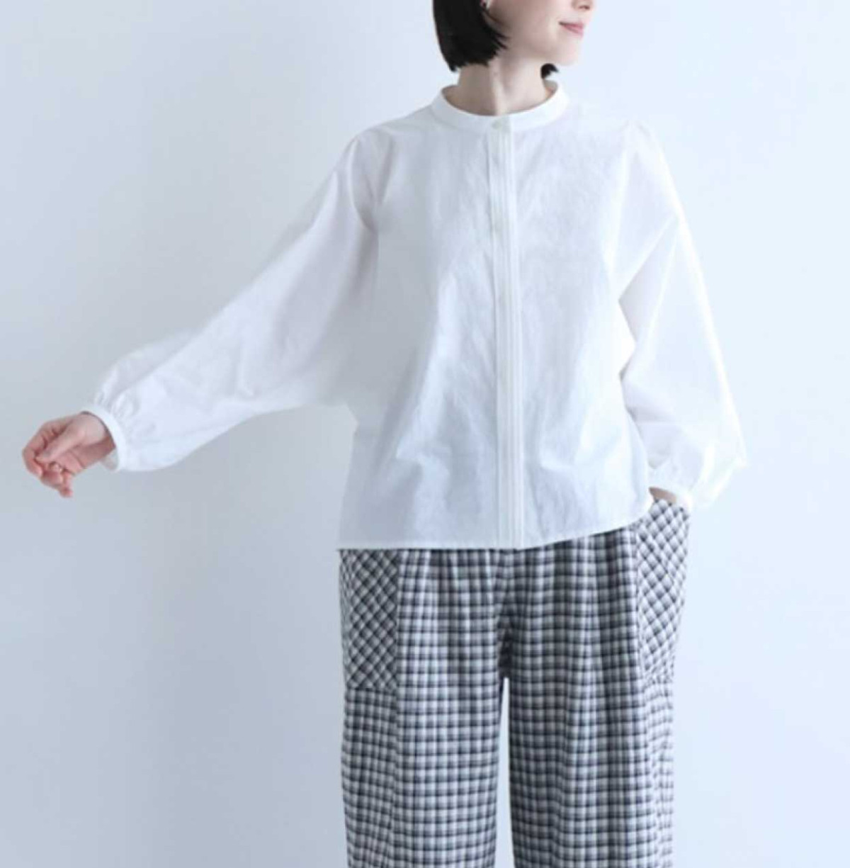 ふっくらとしたバルーン袖が女性らしさを引き立て、上部だけに見えるボタンや前立てのピンタックが、繊細で華奢な印象をプラス。さらりと羽織りとしても活躍してくれる、上品で大人な雰囲気の秋ブラウスです。