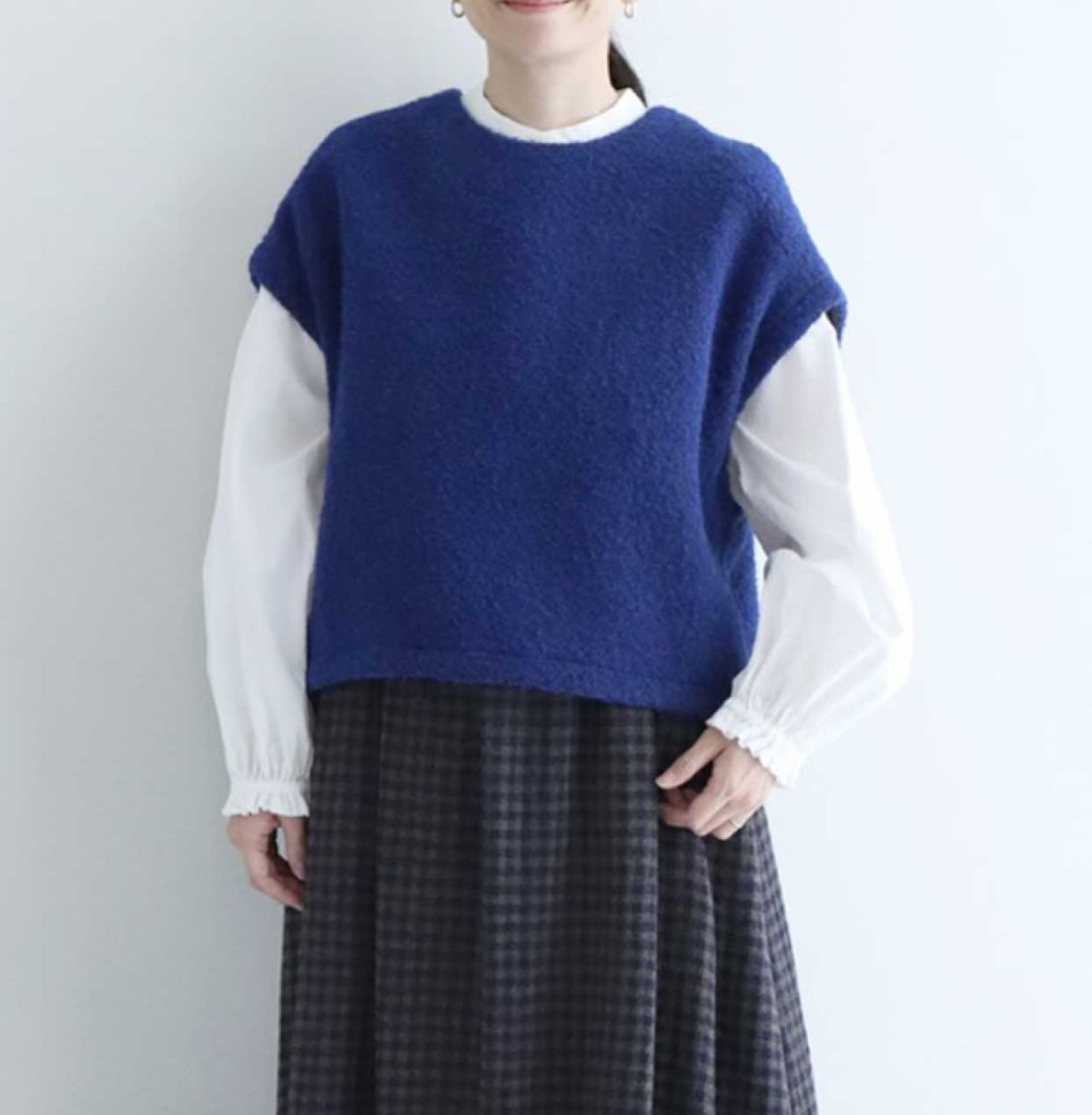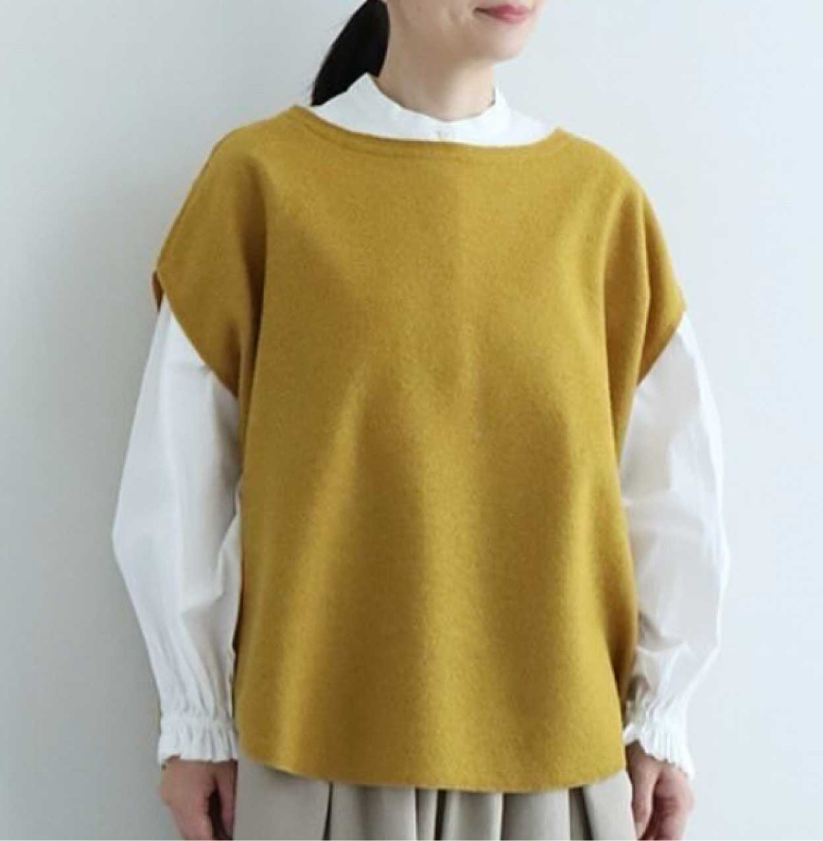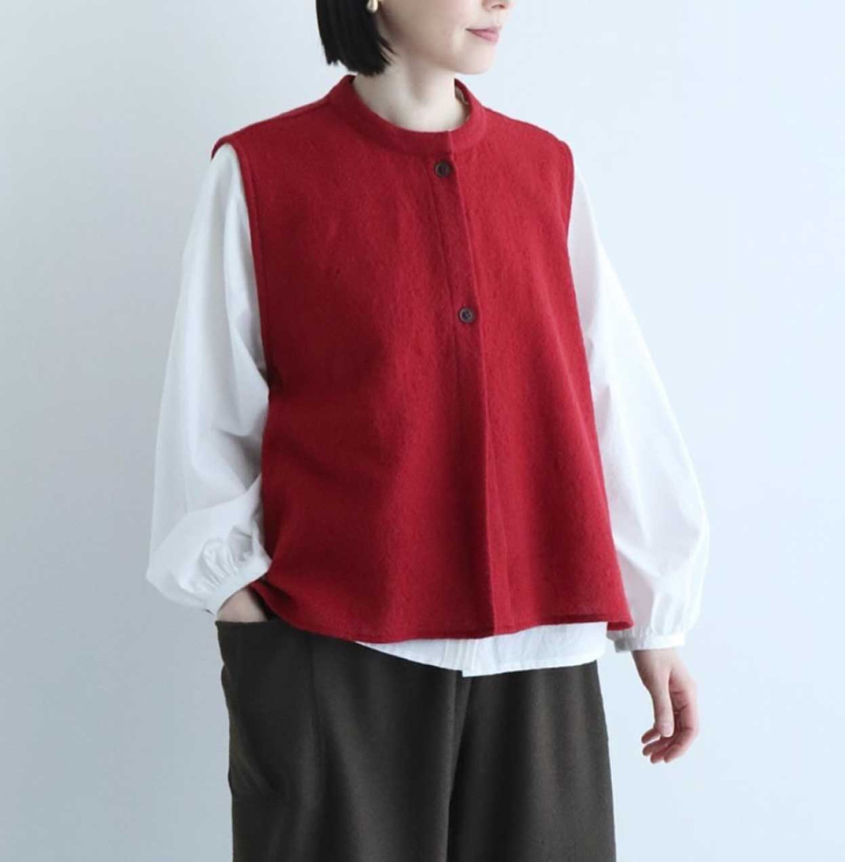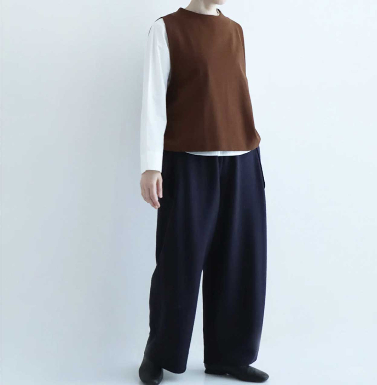 しなやかな印象の被りベスト。 やや首に沿うようなシルエットや、アームのライン、肩線から繋がる衿ぐりのラインなど、曲線的で上品な印象に仕上げています。やや裾にかけて広がっているのでよりエレガントな印象に。パンツとのセットアップで、大人リラックスなスタイリングもオススメです。