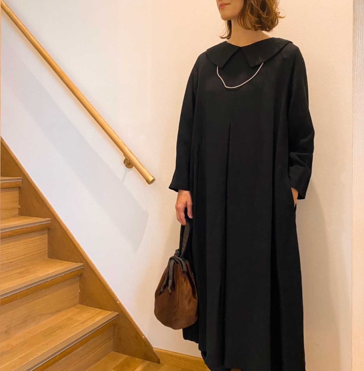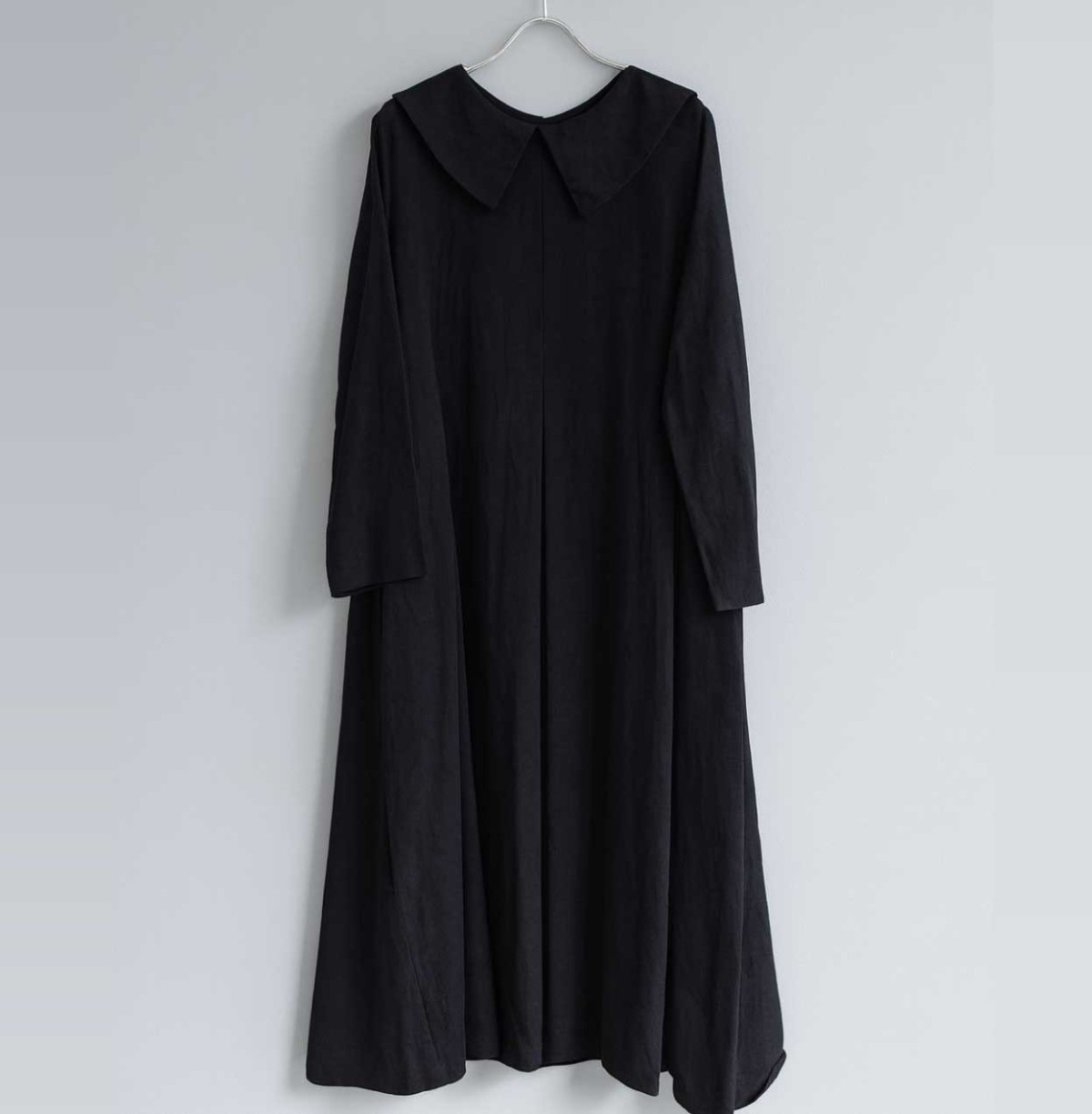 大きな襟がポイントの、可愛らしいワンピース。前後の身頃にはボックスタックが入っており、ほどよい立体感があります。リネン×レーヨンの生地は落ち感があり、広がらずすっきりとしたシルエットに。ナチュラルな風合いで、日常にやさしく寄り添ってくれる一枚です。※生地に見られる節は、素材特有の風合いです。