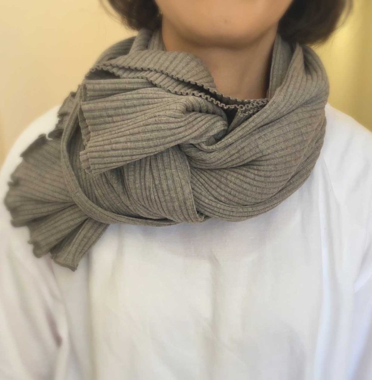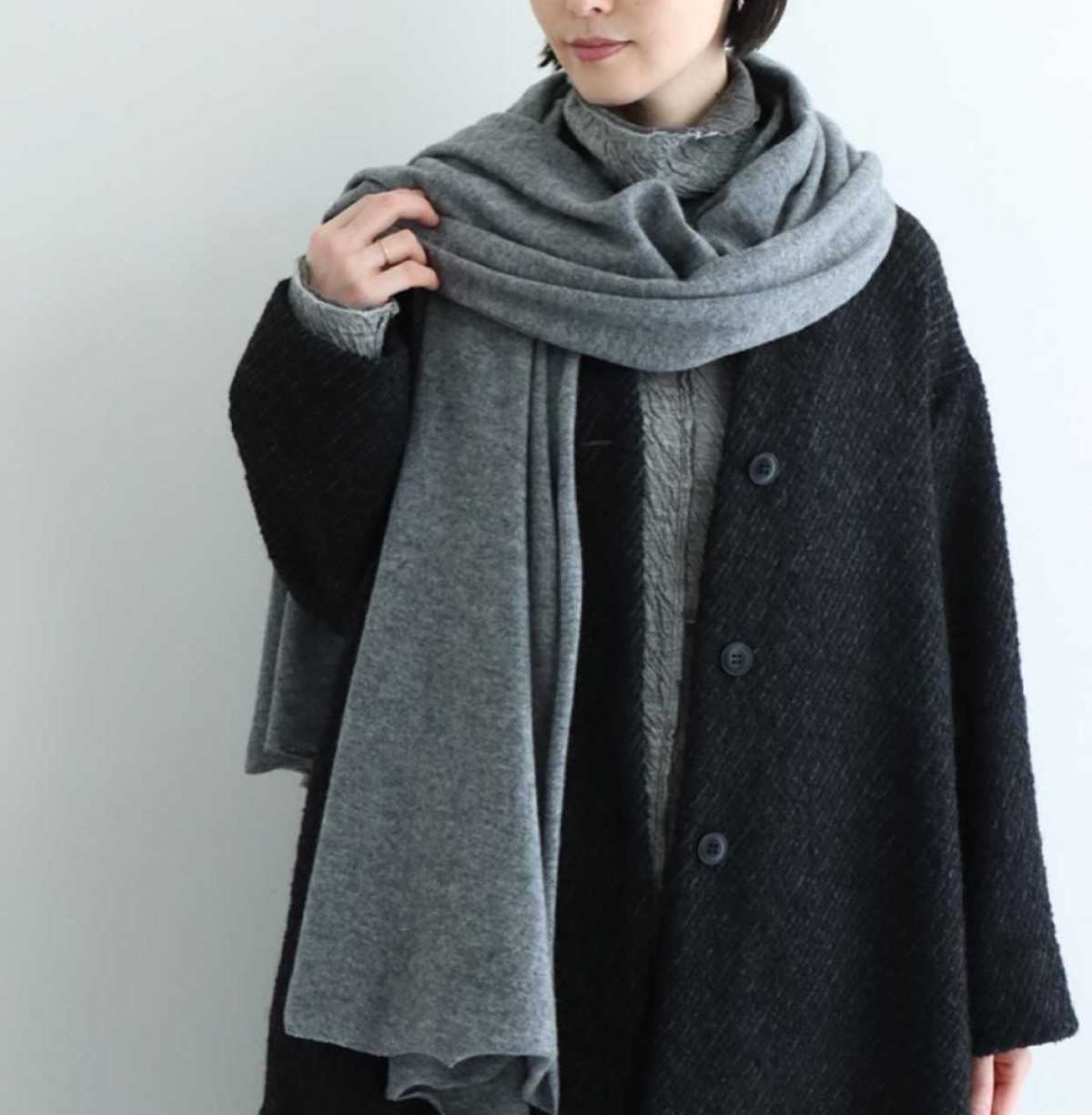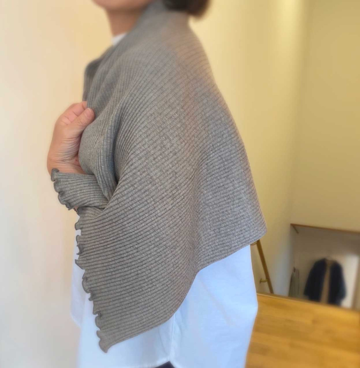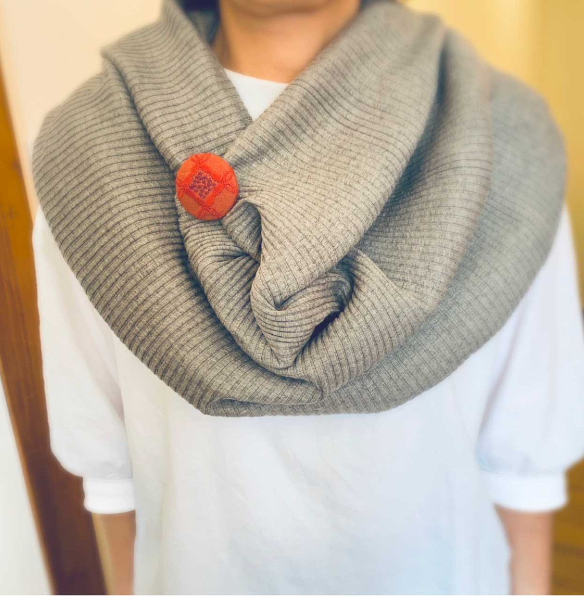 そのまま被るだけでサッと決まりますし、ブローチで留めると雰囲気が変わって楽しめます。