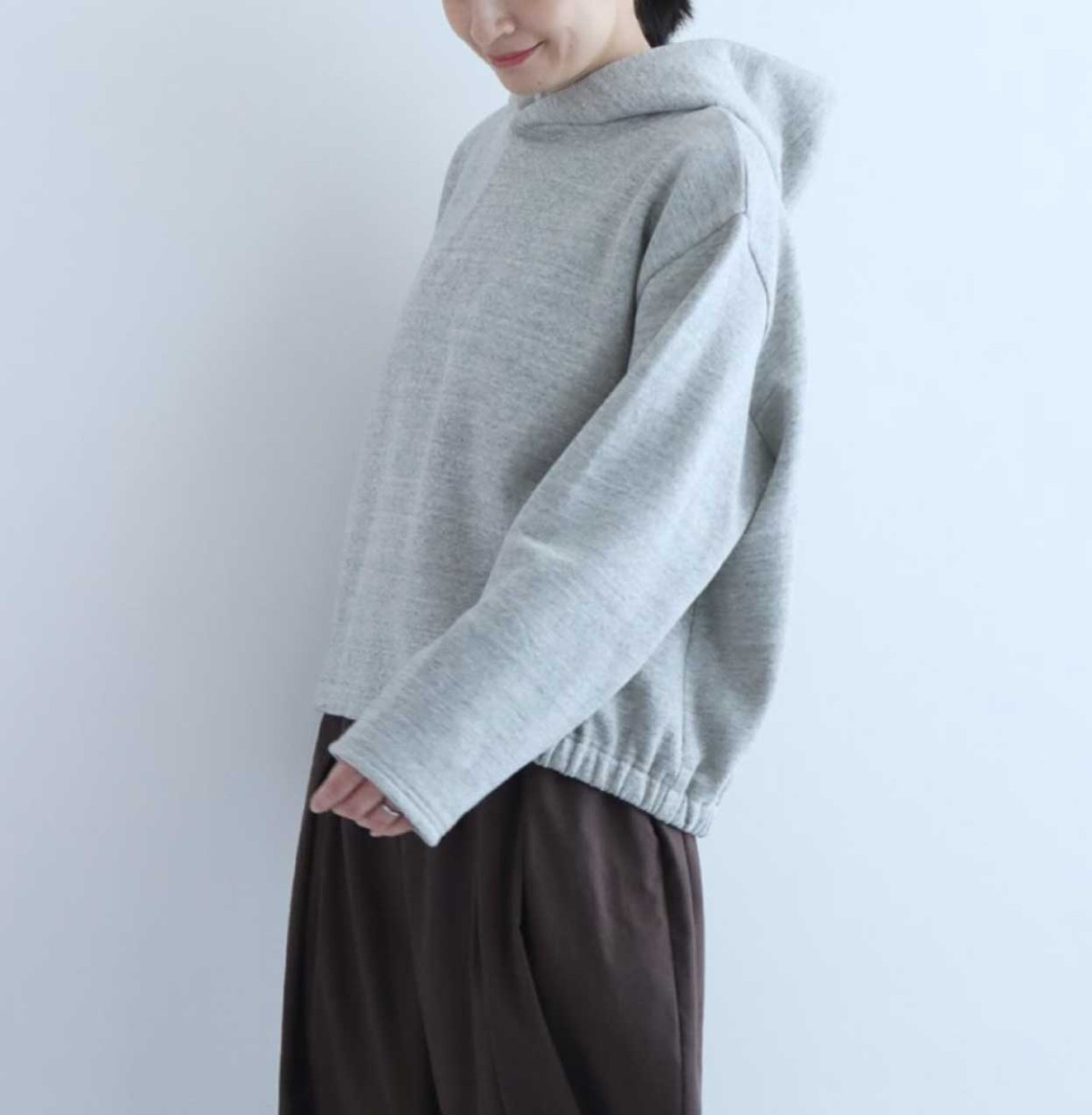 柔らかな裏起毛素材を使った、フード付きのプルオーバー。存在感のあるフードと、裾のゴムギャザーがアクセントになり、大人カジュアルな雰囲気に仕上がっています。
