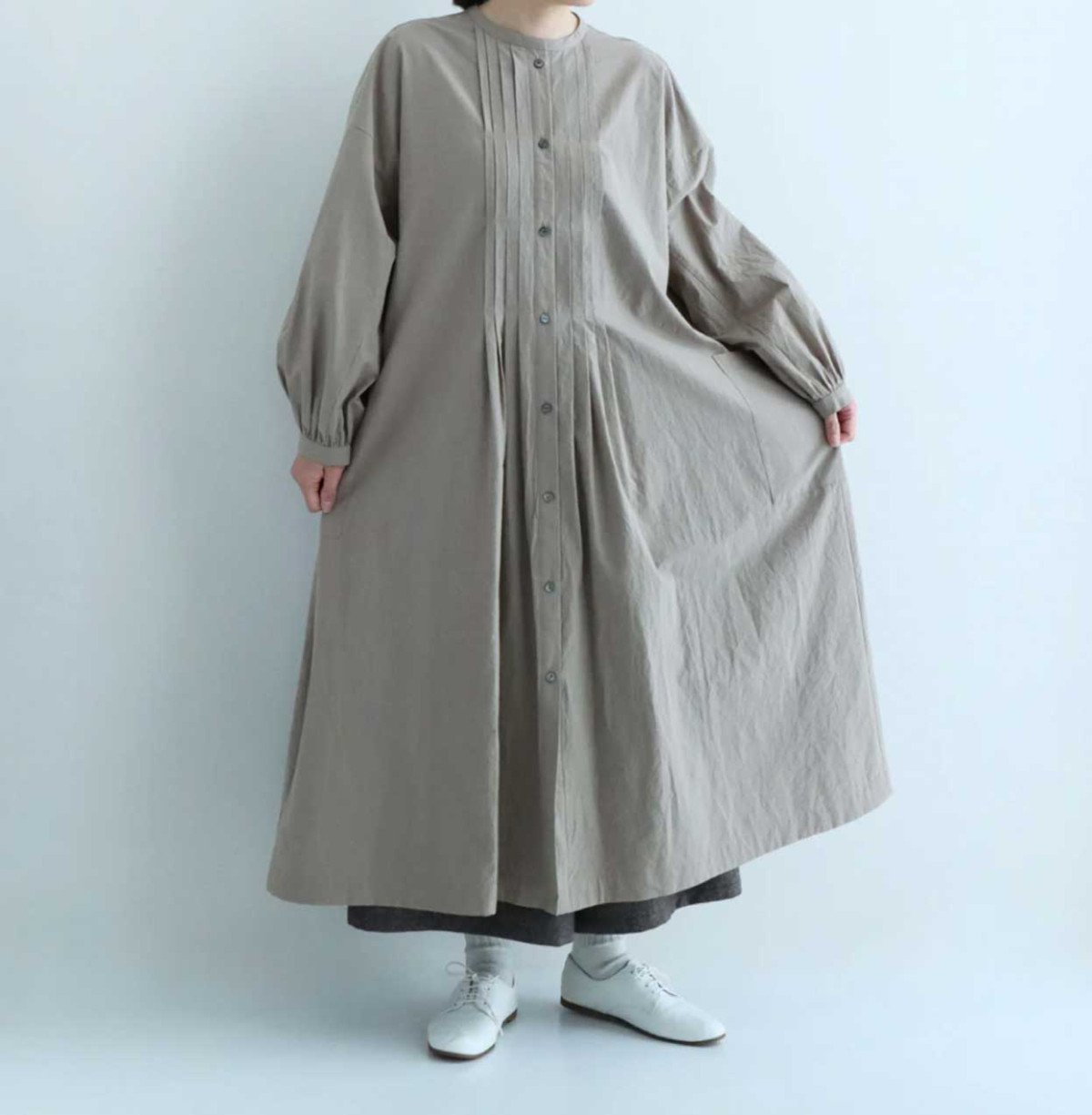 前身頃のタックが印象的な、ゆったりシルエットのワンピースです。タックがすっと消えていくラインが華奢な雰囲気を引き出してくれ、ドロップショルダーなのでバストや身巾もゆったり、リラックスして着られます。後ろヨークにはギャザーをあしらい、動くたびに存在感を感じられるデザインに。