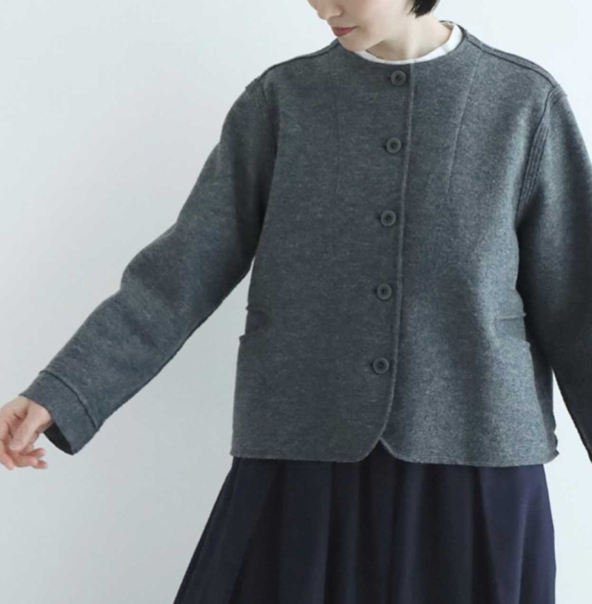 裾は緩やかなカーブを描き、柔らかく女性らしい印象に。やや前下がりの衿が首元をすっきりと見せてくれます。前を開けて羽織れば、自然体のまま上品な大人の雰囲気を演出できる一枚です。