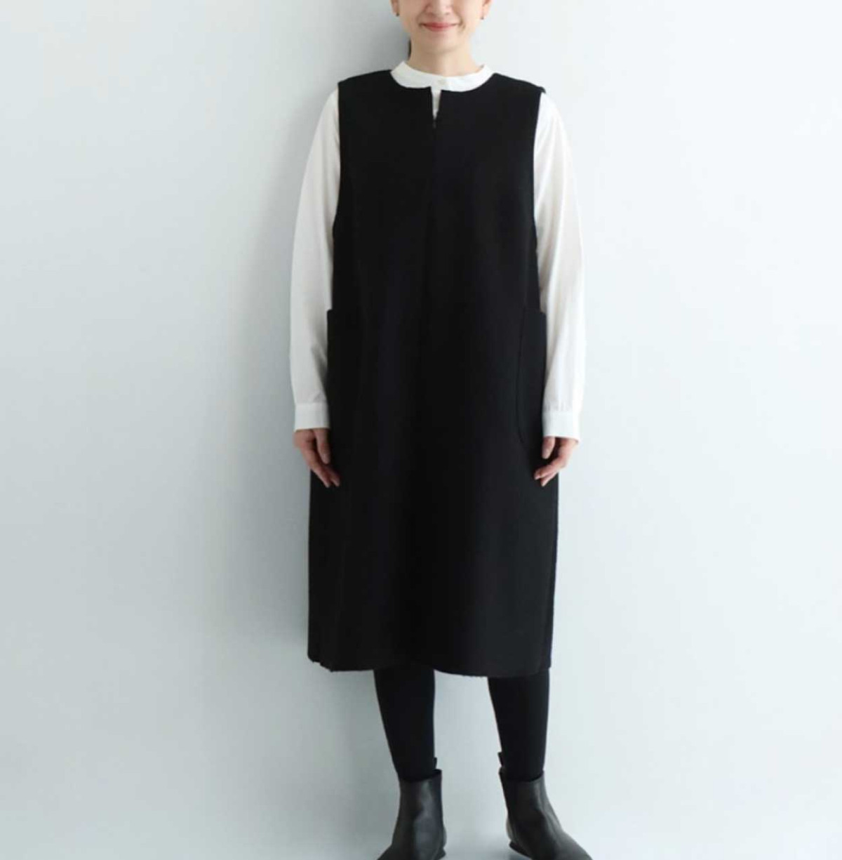 スッキリとしたショート丈のノースリーブワンピース。前開きにし、着脱しやすいようにしながらスッキリとしたデザインになっています。バストにはダーツを施し女性らしさをプラス。脇線をまたぐ大きめなポケットがカジュアルで優しい印象にしてくれます。後ろ裾にはベンツ開きを施し足捌き良く。チュニックとしても着用できるワンピースです。