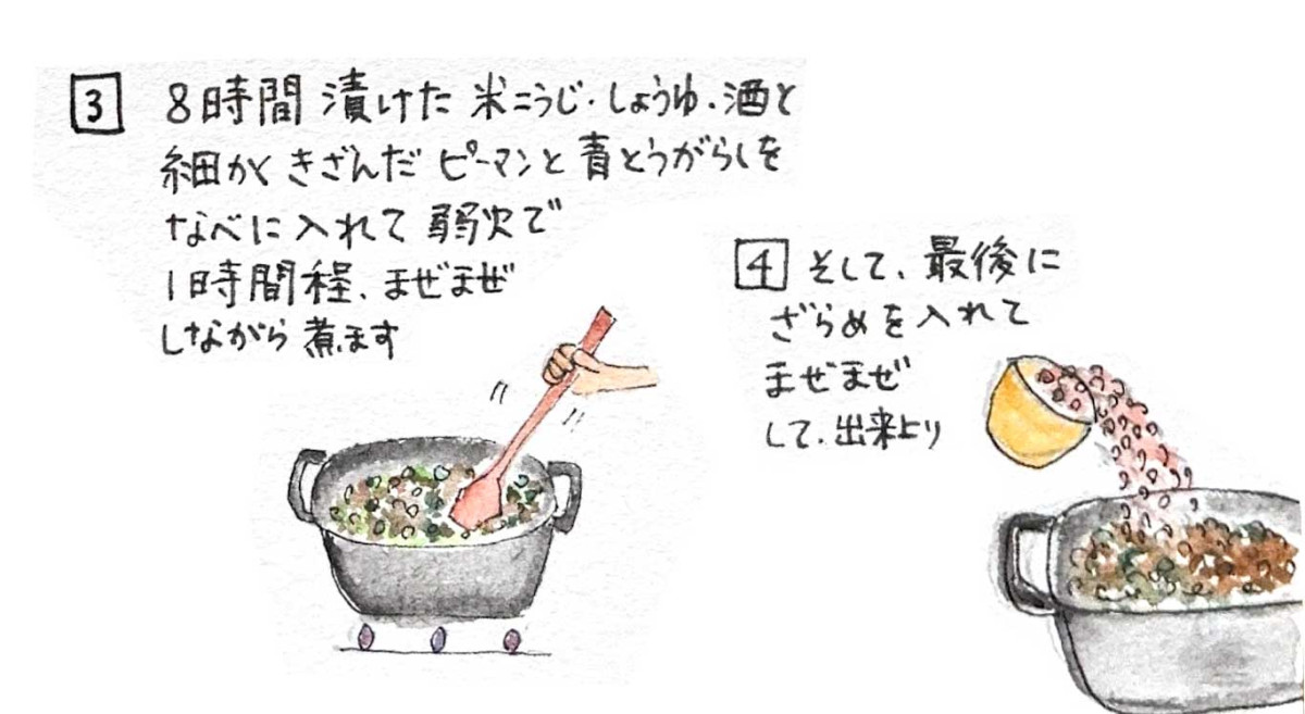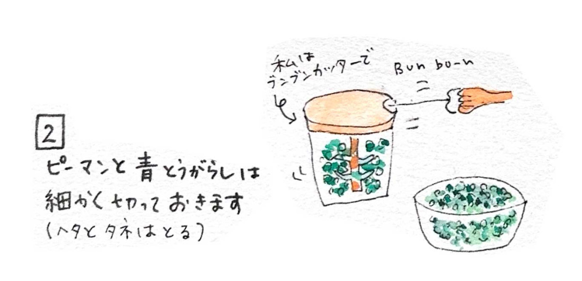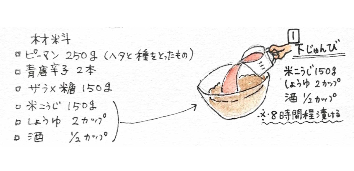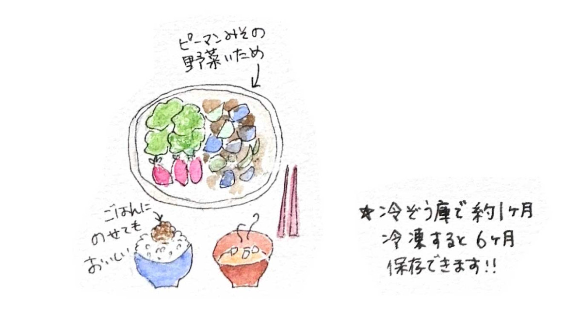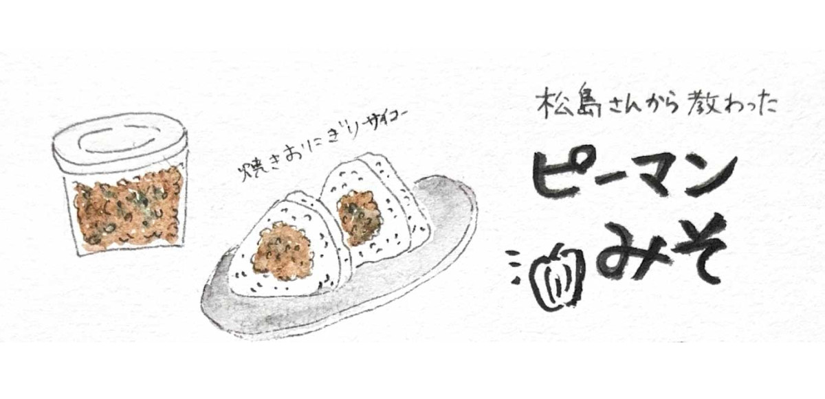 今回は、ゲストの松島様から教わった“ピーマンみそ”を、 小山田さんが手描きのレシピにしてくれました。
